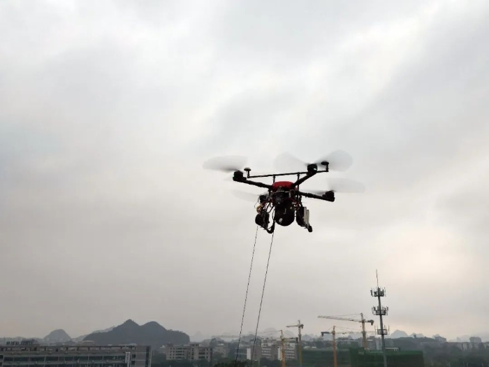 “我這邊準備好了,可以起飛了!”一聲令下,停放在相距數十公里的兩端試驗點上的系留無人機同時起飛,在駕駛員全神貫注地操作下,無人機緩緩升空,并平穩(wěn)地懸停在上方數十米處。
